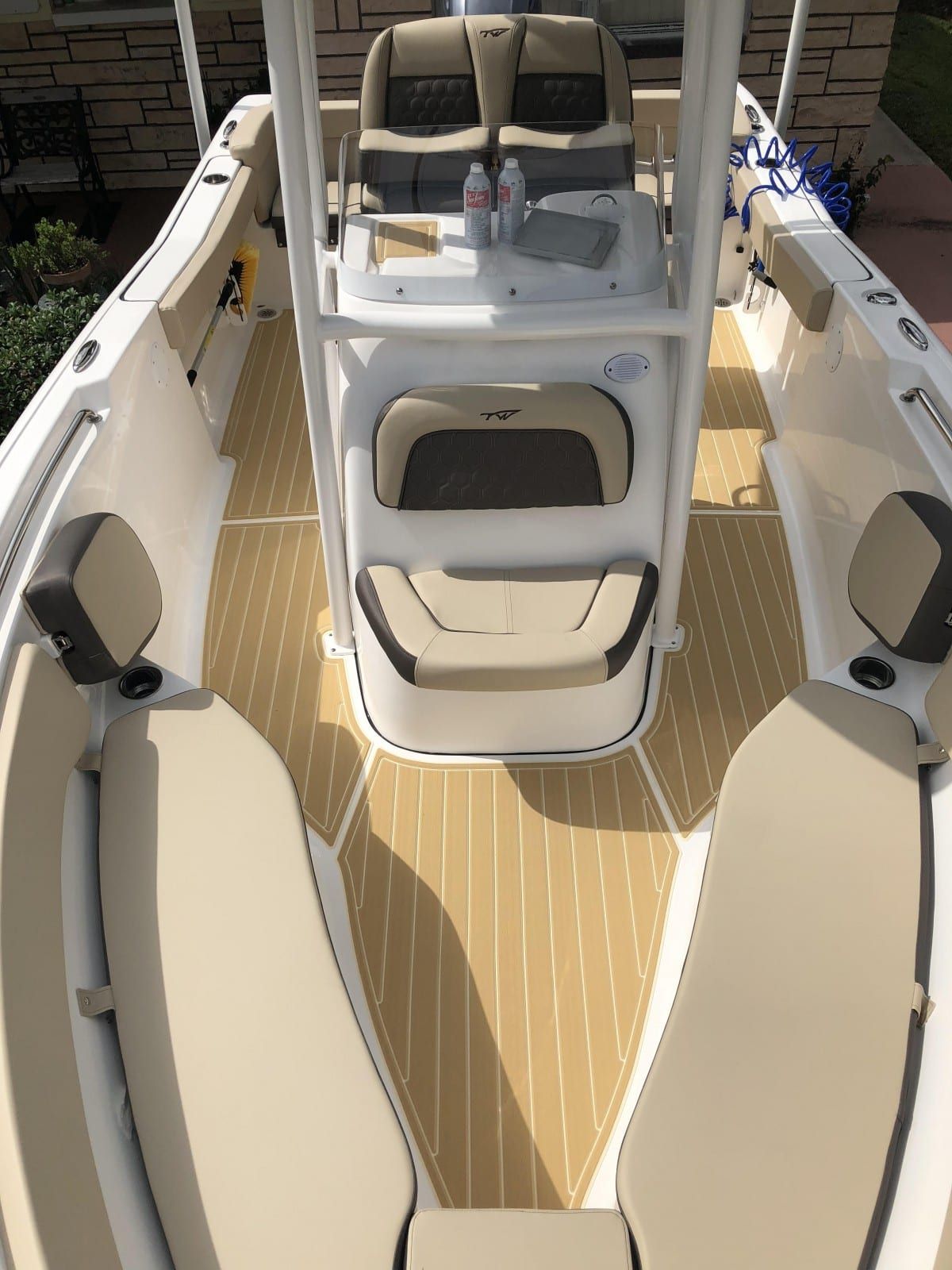 Custom-cut and templated to your cockpit or deck. Comfortable underfoot, non-slip, and significantly easier on bare feet than fiberglass or bare deck.
