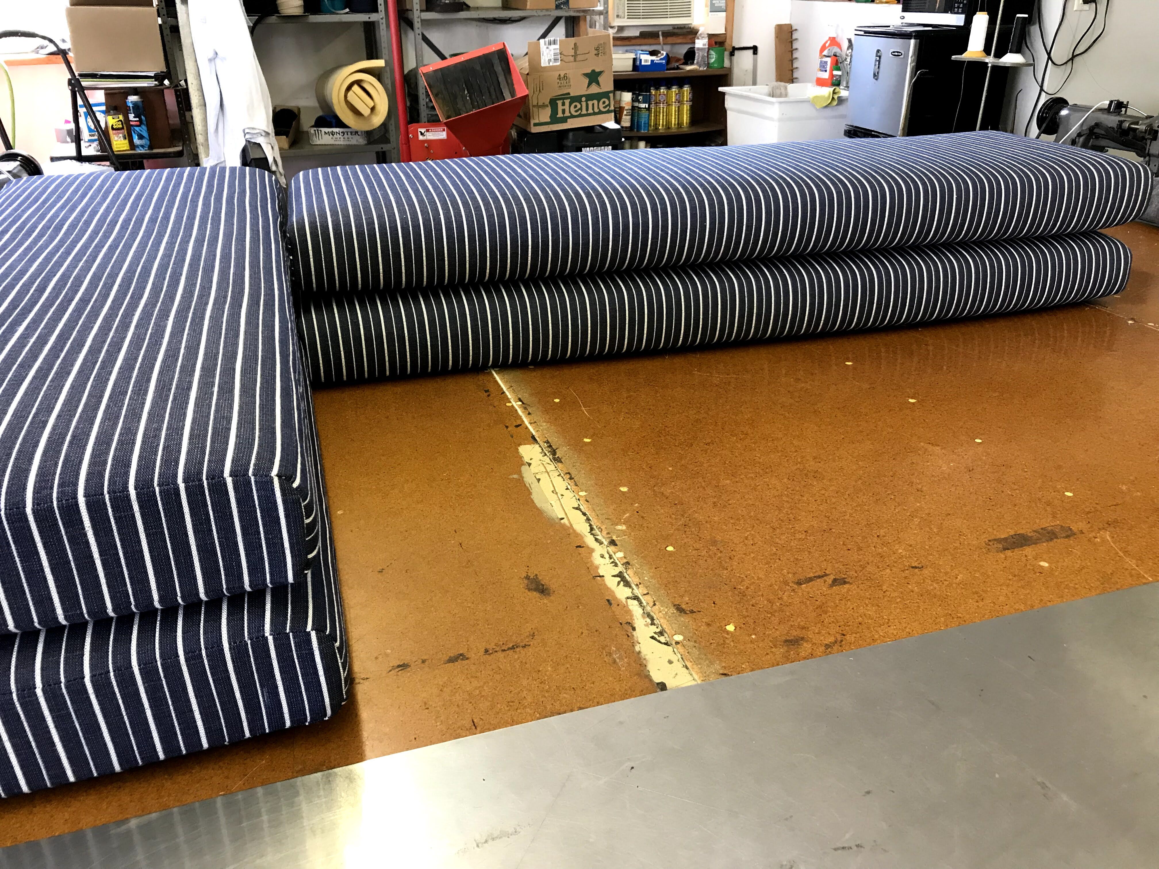 High-density foam cores that hold their shape. UV-resistant fabrics and vinyl that resist fading, cracking, and mildew, selected for the Bay, not a showroom.